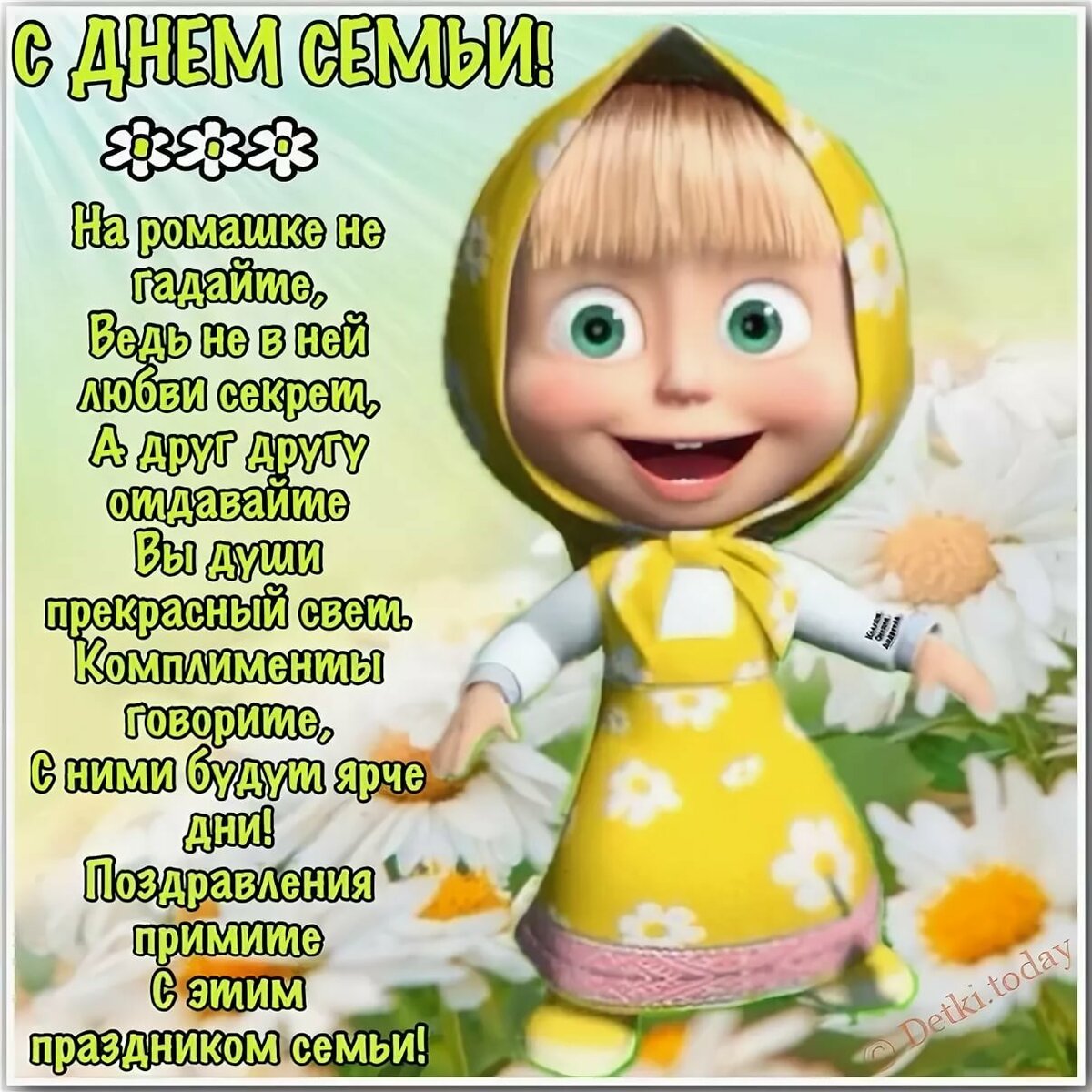 Prikolnye I Korotkie Pozdravleniya S Dnem Semi V Stihah I Proze Muzhchine I Zhenshine Pozdravlyaem V Den Semi Lyubvi I Vernosti Mam I Pap V Sms from tvoiugolok.ru Картинки по запросу с днем семьи любви и верности прикол Желаем всем в любви и в счастье жить! Желаю, чтобы в твоем доме ни один день не проходил без нежных обнимашек, жарких поцелуев, искреннего хохота! С днем семьи, любви и верности поздравления вам шлём. День семьи, любви и верности — день основ нашей жизни, день самых светлых и искренних чувств. Когда все это есть, мы не придаем этому значения и принимаем, как должное, но сколько людей лишены объятий, общения и ласки! Мы очень любим это день, и поэтому с удовольствием поздравляем всех своих родных, друзей и знакомых с этим событием. В день семьи, любви и верности.
